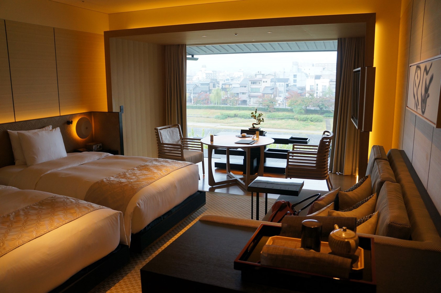 辦完輕井澤婚禮,第二週小蜜月整個都待在京都,前四晚入住獨棟町家,最後兩晚則訂了新開幕不久的Ritz Carlton,M是會員所以運氣很好的被升等到有鴨川景的房間,這一段的鴨川真的比之前住的町家那邊美多了,其實鴨川並非特別美麗,雖然增加了許多美麗幻想,但實際上是乾枯多石頭的一條河道,怪不得周老爸也說高瀨川比較美。