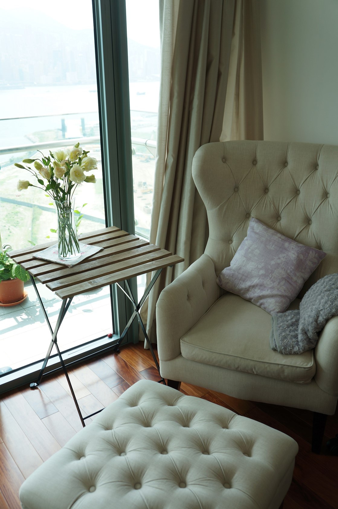 離開工作已經四個月囉,閒雲野鶴、不事生產的日子過得好快,上面那張圖是昨天照的,M出差去,我不巧感冒了,正好有藉口依著我內心的惰性加宅性,窩在家兩三天不出門,恣意奢侈的享受賦閒在家的每一刻。最近天氣轉涼了,我早已迫不及待買了戶外家具,就是等著使用陽台好好享受一下久違的涼空氣,傍晚等樓下西九龍工地大概收工,噪音減少後,把我的椅子移出去,泡杯茶,看著我最愛的海景方向(那面沒有建築和廣告),想著真的日日是好日阿。(其實因為前方大施工,空氣也沒多好,加上樓下就是工地和臨時道路,要等到入夜了才會真的安靜,所以也沒有看起來這麼浪漫啦)