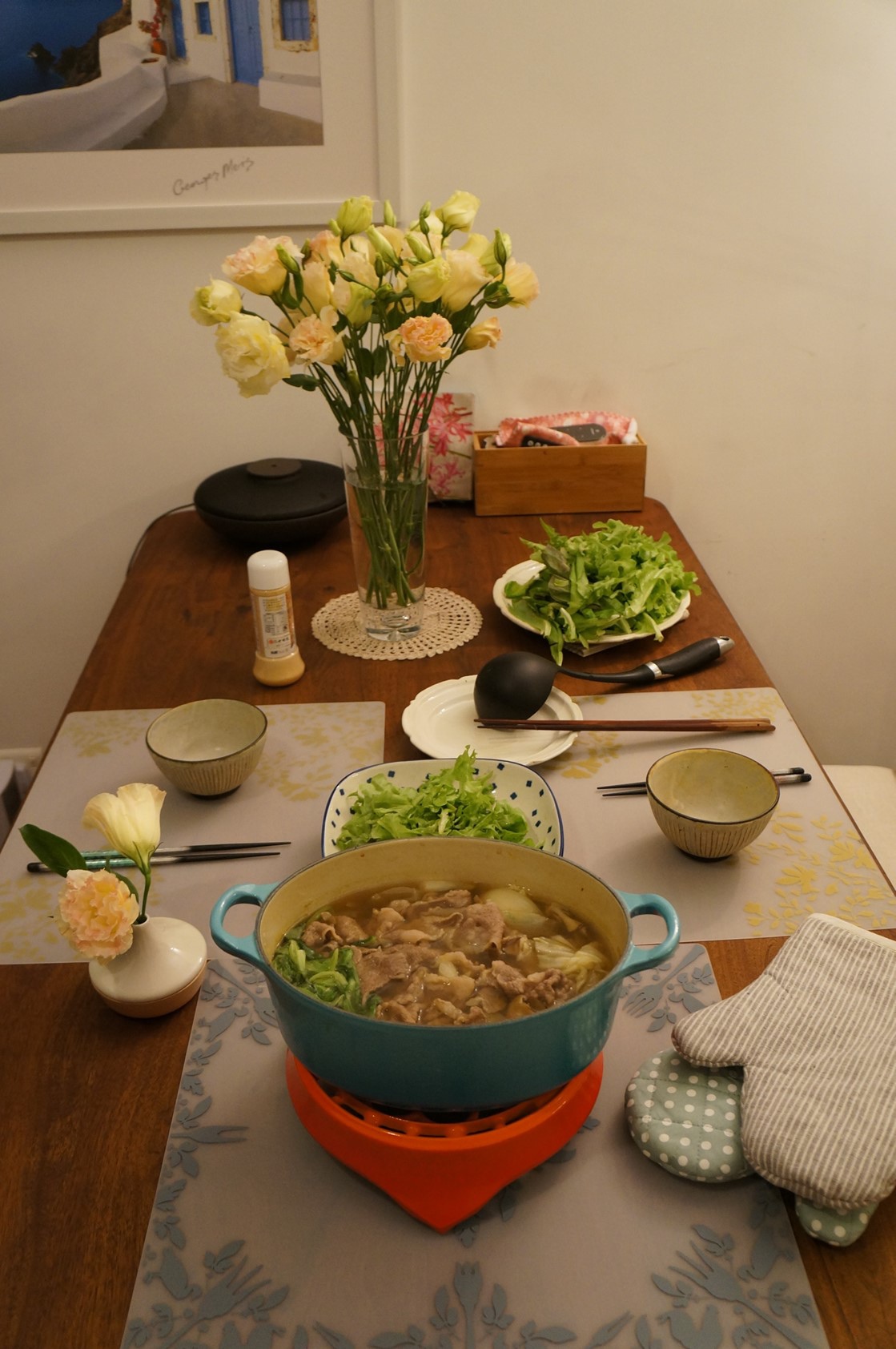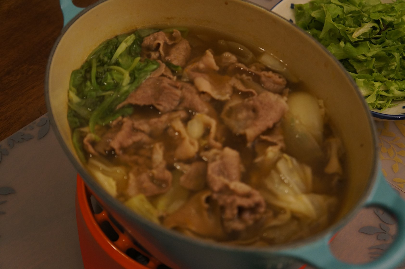 家裡常備著幾包日本火鍋高湯底,天漸冷很想煮一鍋甚麼來吃吃,這個白湯底很適合煮豬肉,放下五花肉片和茼蒿、白菜,還有冰箱剩下的洋蔥等等,就是一餐快速可口的晚餐。