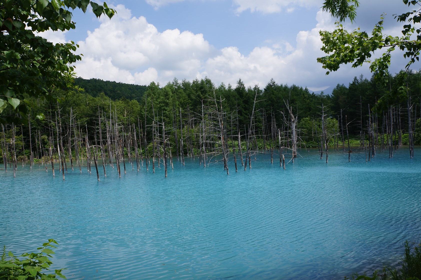 這天是旅行的第四天,我們從美瑛要前往富良野,M說曬了兩天大太陽賞花,想要去山裡晃晃,感覺應該會很清涼吧,我們驅車到了青池,這地方現在很夯,因為Apple的手機和電腦都可以看到青池的預設桌面,整個風景區也沒有完全開發成熟,停車的地方塵土飛揚,雖然遊客也不少,卻讓人有種尋幽訪勝的刺激感。沿著林間小路往裡走,開始可以看見青綠色的湖水,走到最裡頭可以看到開闊的湖面,立在裡面的枯木有點不像真的,說到這青池的成因,網路上也都是日文的介紹我就沒深究了,其實類似的景色香港往機場的路上也會看到,但是在這兒心情不同當然景色也加分許多。
