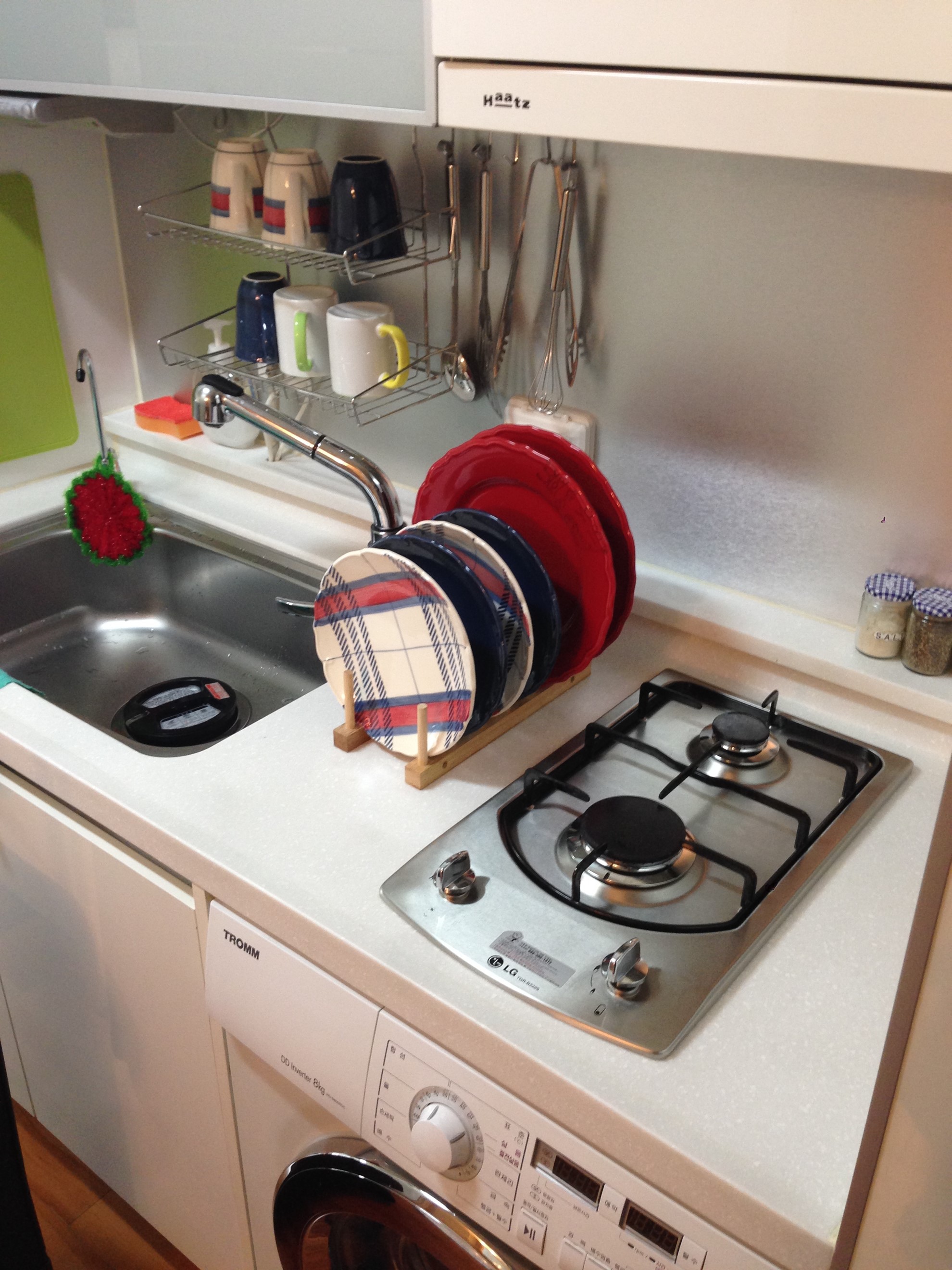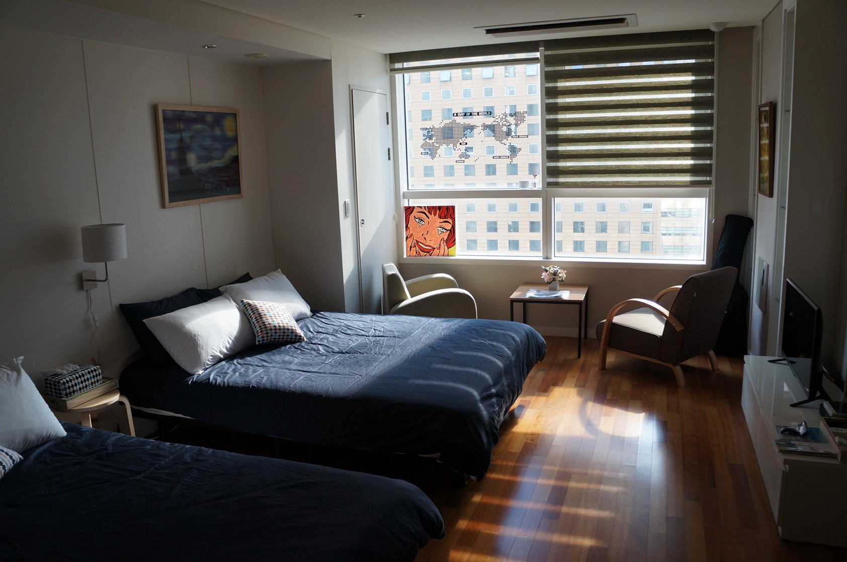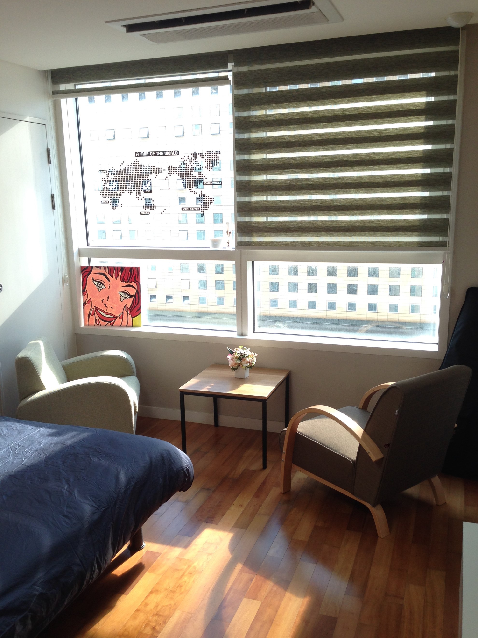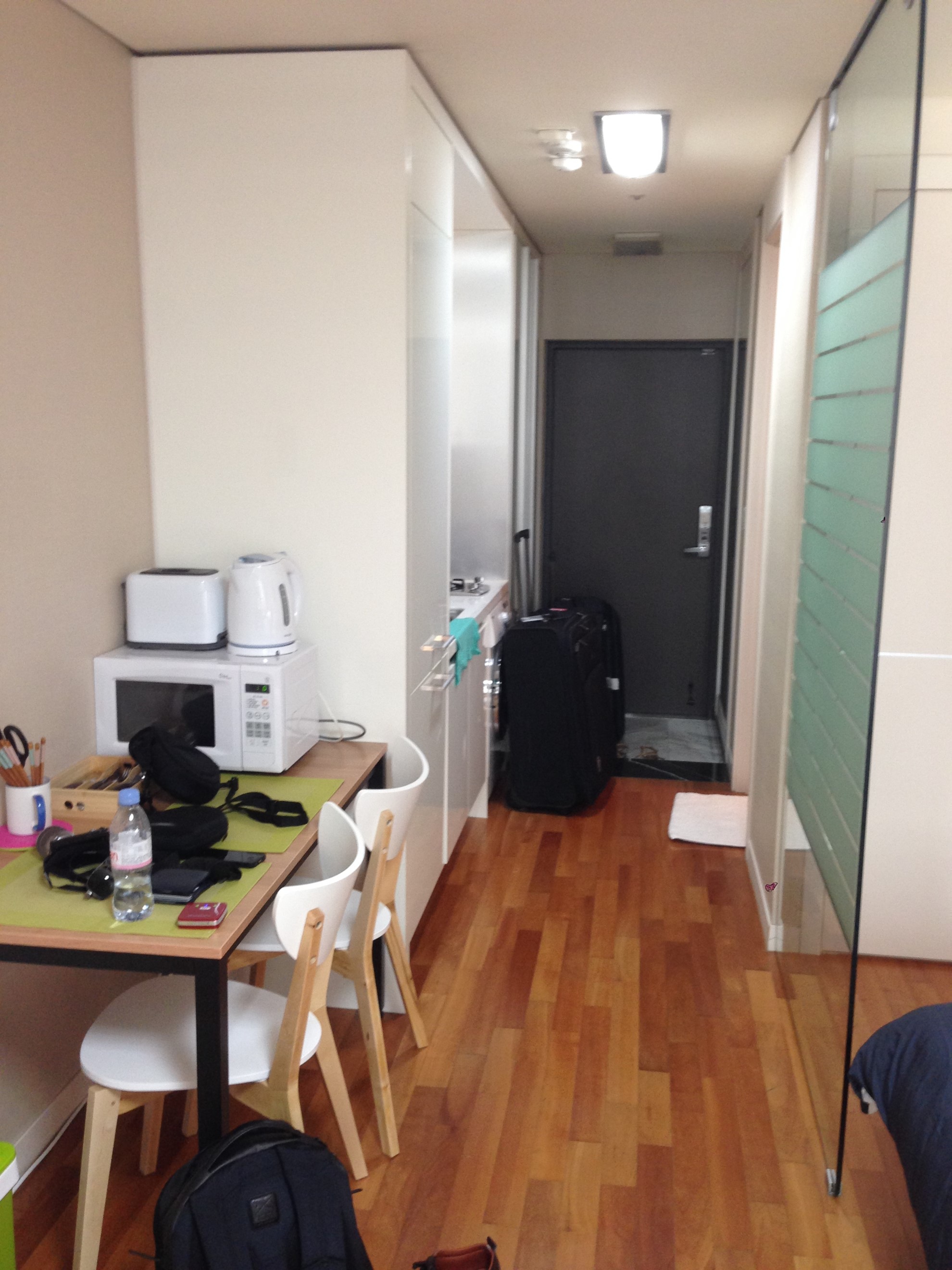 現在旅行或者應該說是"拜訪另一個城市"對我來說,舒適的生活比旅行途中看了做了甚麼都重要,現在不再迷戀背包客自我實現的浪漫,覺得旅行該是生活的延伸,何必把自己搞得這麼累? 所以我喜歡住的地方有家的感覺,這次也是選了公寓,從Airbnb訂的,別的網站有幾個更豪華更寬敞的公寓可選,但最後選了這間交通方便、有兩個雙人床的小公寓,雖然真的有點小,但是這公寓的位置就在鐘閣站旁邊,步行去三清洞和鐘路三街、仁寺洞都不遠,這大樓是住商混合,一般住家我是絕不會選這種,但是對於旅客就不一樣了,樓下幾層就有好多間餐廳和各種小商家,方便的不得了,其中有三間餐廳是有被介紹的,後來還發現還有間炸雞店喔! 若是跟大家一樣被"星星"一劇洗腦到很想叫炸雞啤酒外送,直接走到樓下買就好,那天我們也是卯起來超想吃炸雞,接電話的小姐其實可講英文,但是卡在我們沒有當地號碼,最後還是不讓我點,真是太可惜了,我們決定到附近自己買回來,走一走發現鐘閣後面一條街真是大有玄機,整條像是西門町加東區後面餐廳群一樣,充滿了各種餐廳,光是炸雞店就有十幾家(或許幾十家),街上都是年輕人,還碰到某電視節目外景拍攝,讓我更加滿意這個公寓啦。