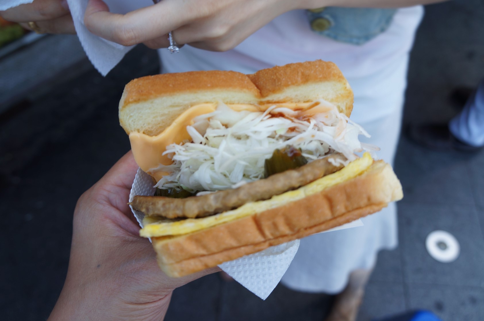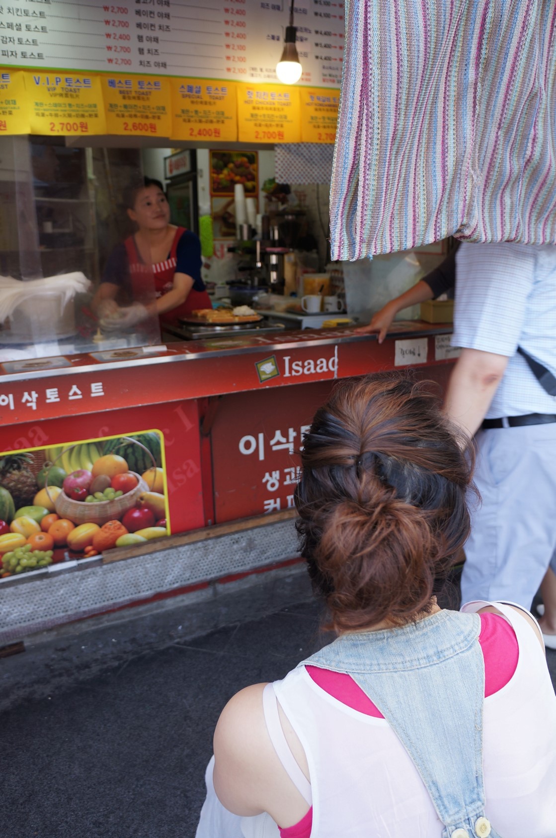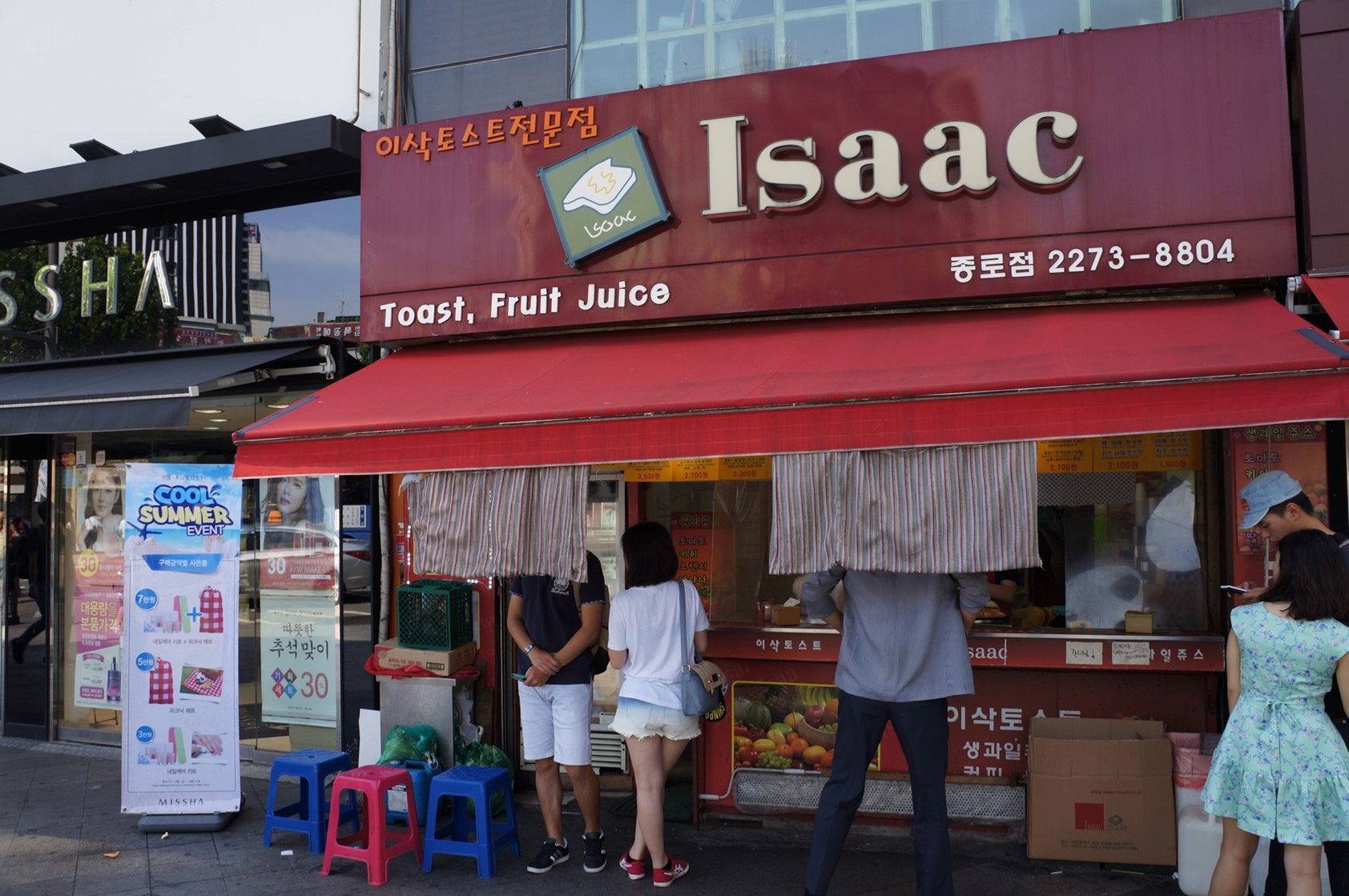 感謝眾網友介紹,我們也坐了兩站公車去鐘路三街的Isaac早餐,果真很像台灣的美而美,都有中文翻譯讓人安心許多,尤其還有新鮮果汁,只可惜沒有座位,我們就坐在前面幾張小凳子上快速吃完,我點的好像是烤牛肉MVP之類的,還算不錯吃,跟台灣早餐店的三明治那種甜甜鹹鹹的味道很像,但是肉是那種薄片漢堡肉,跟我想像的整片肉不同,我看有些網友寫得多好吃,其實我覺得就是還不錯,如果你跟我們一樣剛好想不到要吃甚麼是可以吃吃看,但不能說是有多美味啦。但是值得一提,這間店的小姐真是很棒,永遠面帶笑容親切的招呼,煎炒肉片時也很優雅,讓人心曠神怡,讓整個攤販和路邊吃三明治的格調提升許多。