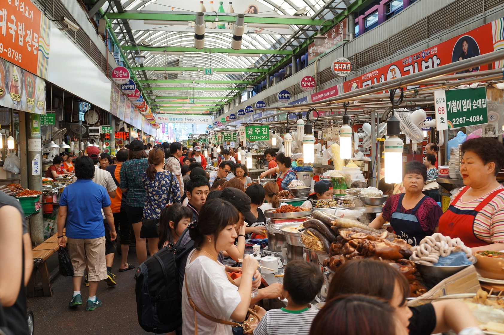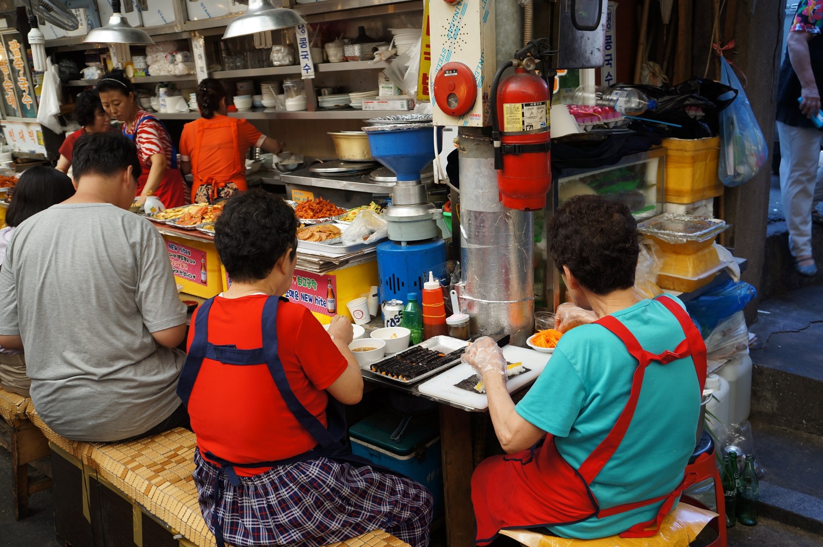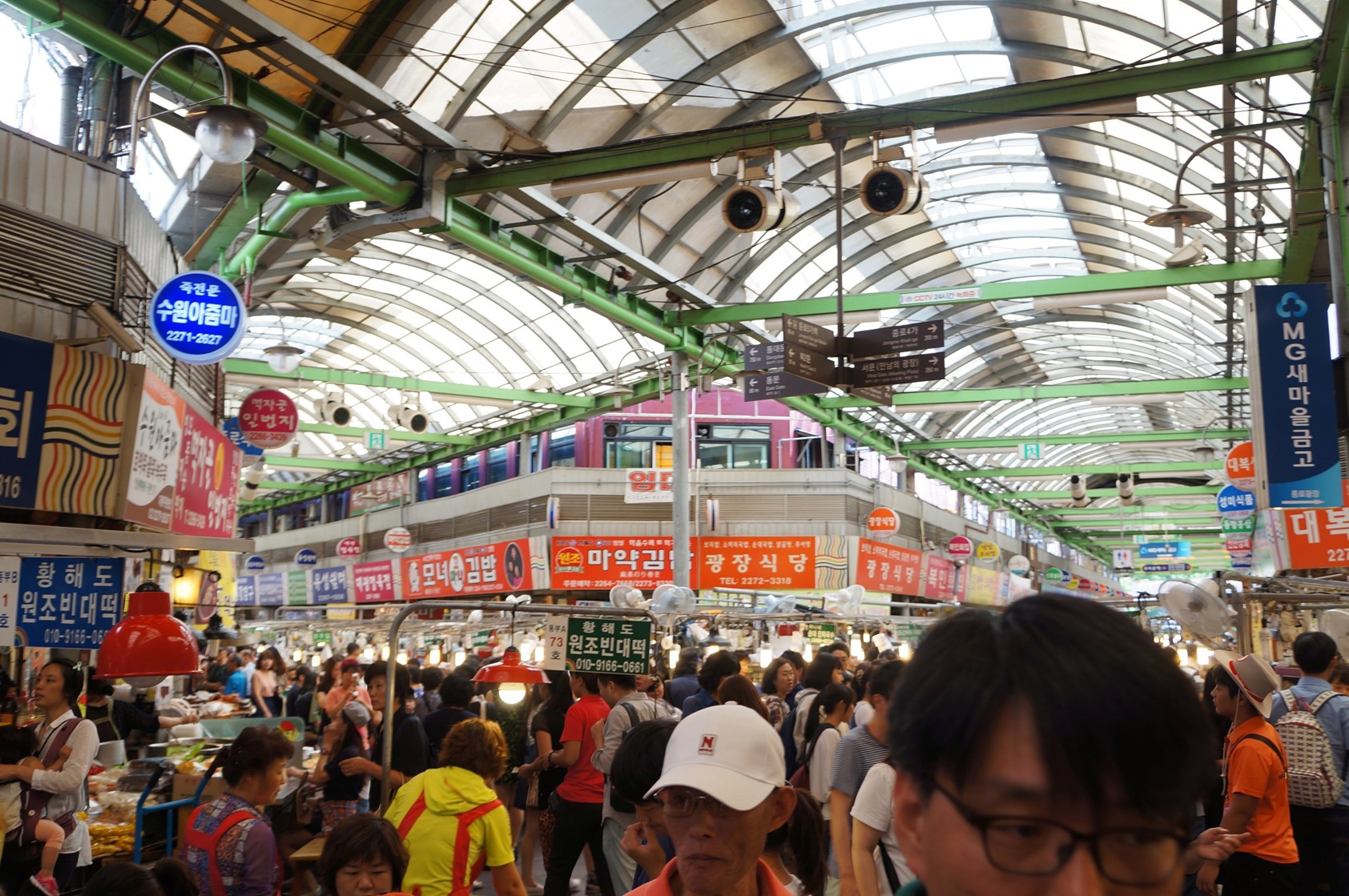 這天早上慢慢的爬起來,實在很懶得出門,M去樓下幫我買了杯咖啡,我才悠悠的梳洗出門,想到可以去廣藏小吃街吃早餐,馬上上網查一下,也好多人介紹必吃的東西,沒多看就先去再說,果真是精彩的不得了啊! 基本上這是個綜合的市場,有賣現做小吃的,也有賣布料、用品、生鮮食材的,我們從北二門進入,馬上就是精彩的小吃區,人很多觀光客也超多,到處都是講中文的人客,大都數的菜單上都會有中文翻譯,連我們坐下來吃麵的店家也有大嬸是講中文的,韓國的中文化真是很驚人啊!